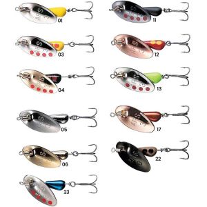Coloris naturels ou flashy, simple ou triple, montures spéciales no-kill : tu choisis selon les conditions. On bosse avec les marques fiables comme Mepps, Panther Martin ou Smith.